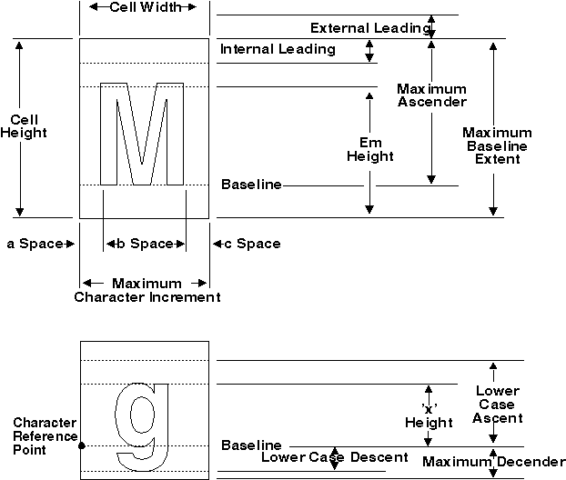 The distance from the baseline to the top of the character cell is the character-cell ascent. Similarly, the character-cell descent is the distance from the baseline to the bottom of the character cell. The following figure illustrates characters drawn along a baseline inside their character cells. Various font metrics also are illustrated.