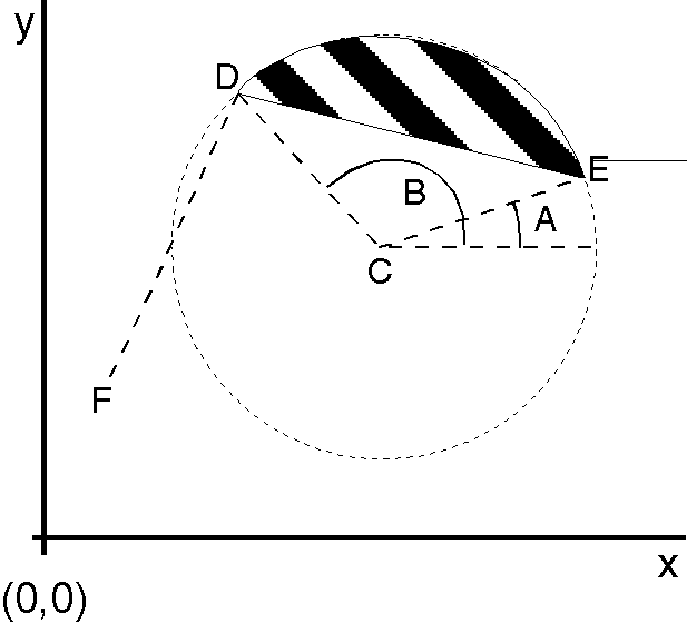 The circle in the preceding figure is defined by the current arc parameters. Point F is the current position, and point C is the center of the arc as specified with the first GpiPartialArc call. The first GpiPartialArc call-with the line type set to LINETYPE_INVISIBLE-moves the current position to point D. The second GpiPartialArc call-with the line type set to LINETYPE_SOLID- draws the chord from the current position (point D) to the start point of the arc (point E), and draws arc ED.