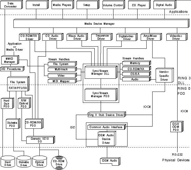 At the Ring 3 level, OS/2 multimedia employs a Media Device Manager (MDM), which manages logical media devices representing audio adapters, CD-ROM drives, and other hardware devices. Amongst its duties, MDM determines which process gains access when two or more applications attempt to control a media device.
