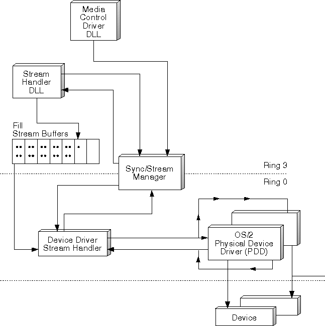 Stream handlers are responsible for controlling the flow of application data, in a continuous, real-time manner. Each handler can establish multiple data stream instances, where each stream involves data of a specific type; for example, MIDI (Musical Instrument Digital Interface) or ADPCM (Adaptive Delta Pulse Code Modulation). The application, through the use of a media control driver, invokes an SPI function to create the stream and another SPI function to activate the data stream. The application does not have to continuously invoke SPI functions to maintain data flow. Instead, the stream handler keeps the I/O continuous, simplifying the operations of the application.