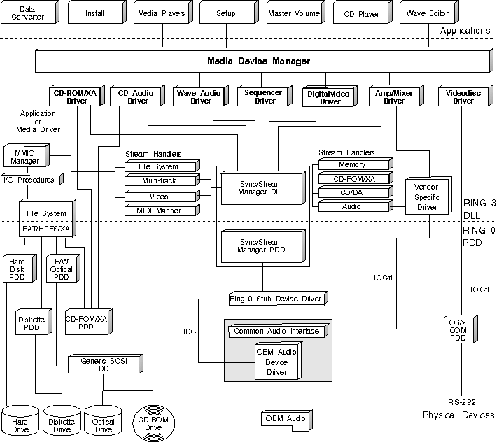 The objects that receive the device control commands issued by multimedia applications using mciSendCommand or mciSendString are called media control drivers. Media control drivers are OS/2 dynamic link libraries (DLLs) that provide a level of hardware independence for applications. The Media Device Manager (MDM) provides the interface to these media objects. The MDM also provides a level of component management, making it possible for an application to synchronize its use of MCDs as well as share MCDs with other applications.