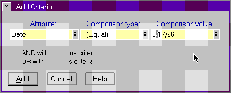 Use the Add Criteria dialog to add criteria to the search for log entries. Use the three entry fields (Attribute, Comparison Type, and Comparison Value) to construct the criteria. Each entry field has a pull-down list box that contains valid values for the field. You can select an item from the list box, or enter text in the field.