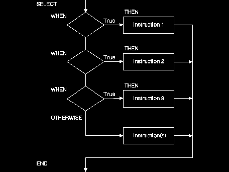 SELECT tells the interpreter to select one of a number of instructions. It is used only with WHEN, THEN, END, and sometimes, OTHERWISE. The END instruction marks the end of every SELECT group. The SELECT instruction looks like this: